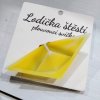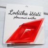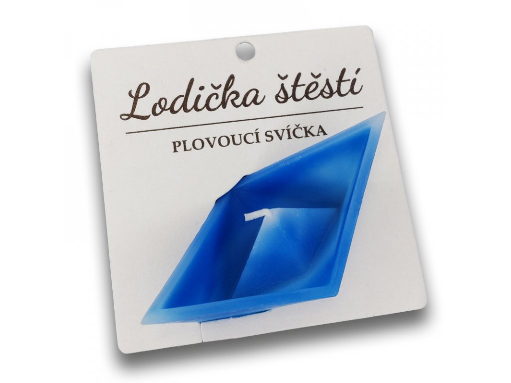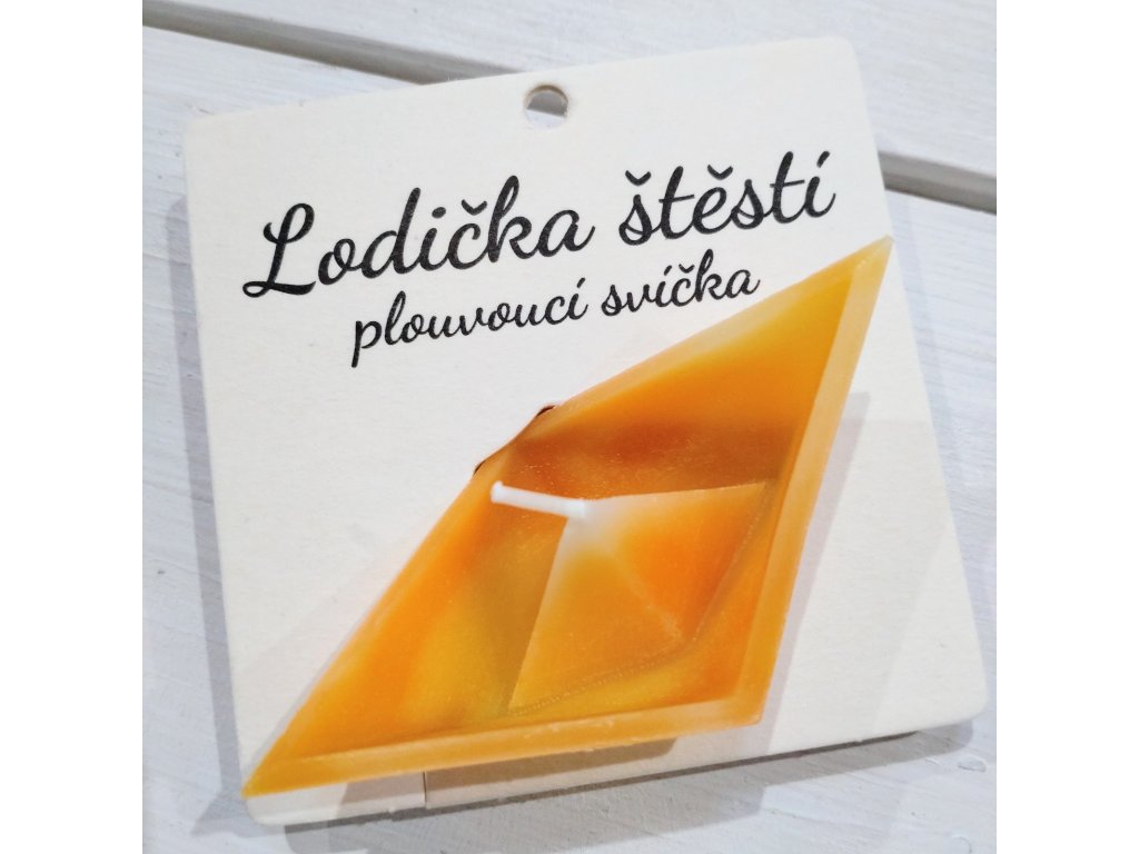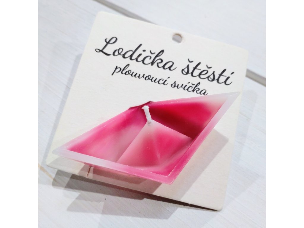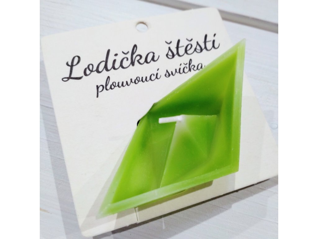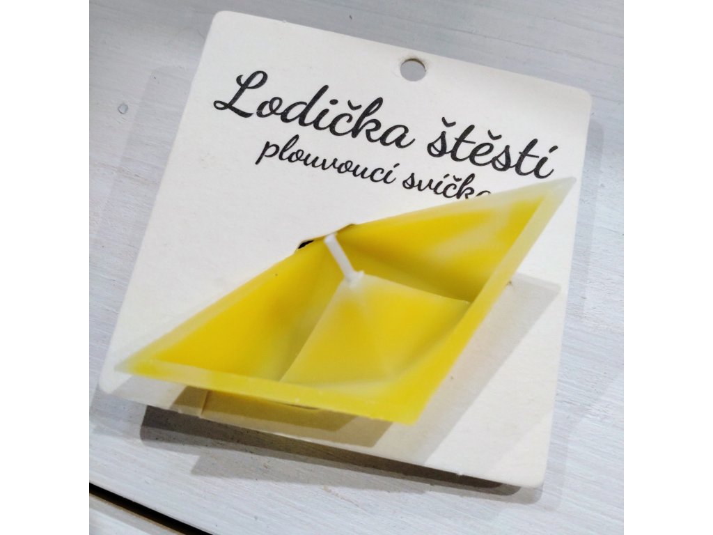 Malá lodička štěstí zasazena do papírové kartičky. Na kartičce je "Lodička štěstí".